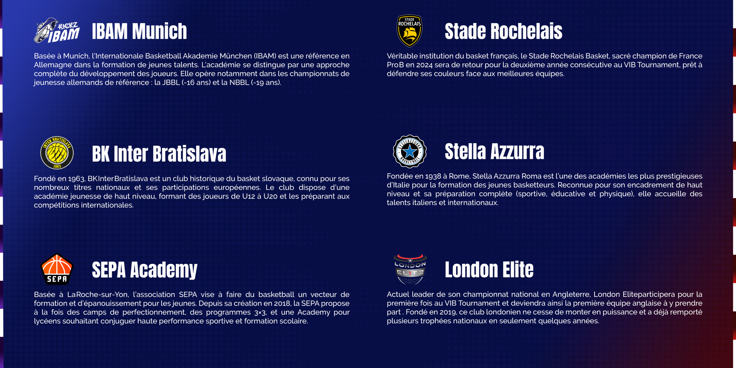 Le VIB Tournament revient du 11 au 14 Décembre 2025 plus fort que jamais ! 4 jours de compétition intense, de spectacles et de passion autour du basket international U18 masculin.`